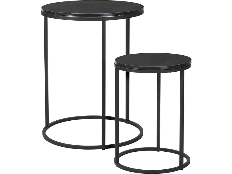 Entdecke dieses elegante Set aus zwei Beistelltischen DOMIA. Mit ihren Maßen von 40x40x50cm verleihen diese Tische aus schwarzem Metall deiner Wohnung einen modernen Touch. Die MDF-Tischplatte bietet eine ideale Oberfläche für deine Deko-Objekte oder Getränke. Das einheitliche schwarze Finish der Beine und des Gestells lässt sich problemlos in verschiedene Einrichtungsstile integrieren. Erkunde die anderen verfügbaren Farben, um diese Tische perfekt an deinen Raum anzupassen. Das robuste Metall sorgt für Stabilität und das kompakte Design macht die Tische praktisch, um den Platz in deinem Wohnzimmer optimal auszunutzen. Sekundäre Abmessungen: 30 m.