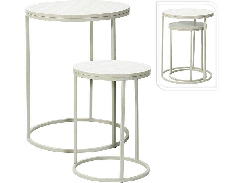 Das Set aus zwei Beistelltischen DOMIA bringt einen Hauch von Eleganz in deine Wohnung. Mit ihren Maßen von 40x40x50cm passen die weißen Tische problemlos in jeden Raum. Das Metallgestell sorgt für eine hohe Stabilität, während die MDF-Platte eine glatte und praktische Oberfläche bietet. Die Beine, ebenfalls aus Metall und in Weiß, vervollständigen das schlichte Design. Entdecke weitere Farben, um deinem Wohnzimmer noch mehr Individualität zu verleihen. Das makellose weiße Finish passt zu jedem Einrichtungsstil. Diese Tische sind der Charme, den du brauchst, um deine Einrichtung aufzuwerten. Das zweite Maß ist 30 cm.