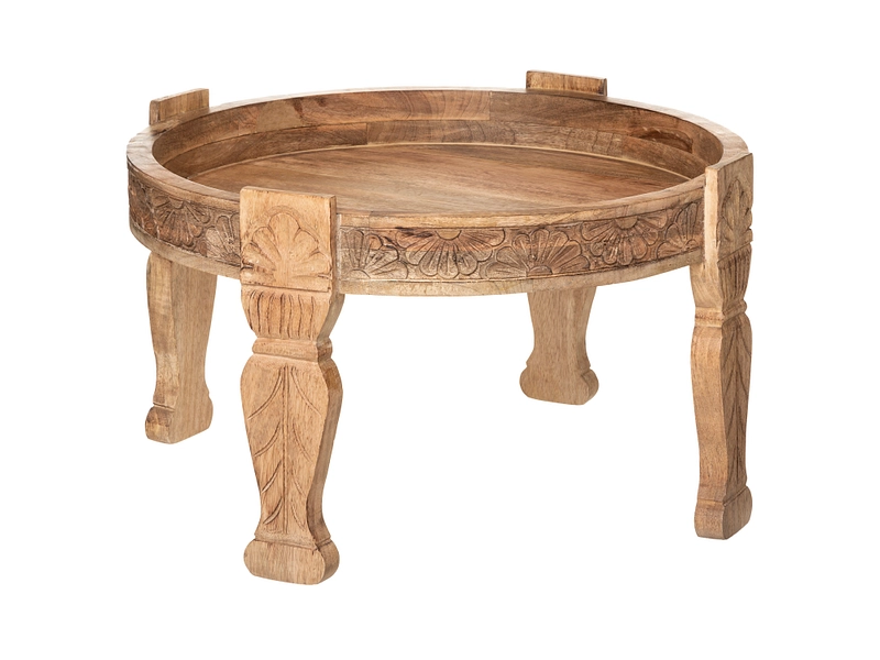 - Geschnitzte Motive an den Beinen und der Kontur der Tischplatte