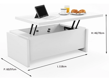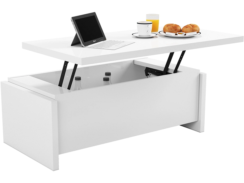 - Schick und elegant in seiner glänzend weißen Lackierung, mit großzügigen Proportionen gestaltet, ausgestattet mit einer großen, hochklappbaren Tischplatte und einem geräumigen Stauraum im Inneren sowie aus robusten Materialien gefertigt, wird dieser Couchtisch eine Bereicherung für Ihr Wohnzimmer sein – ein Zeichen von Eleganz, Schlichtheit und Funktionalität zugleich.