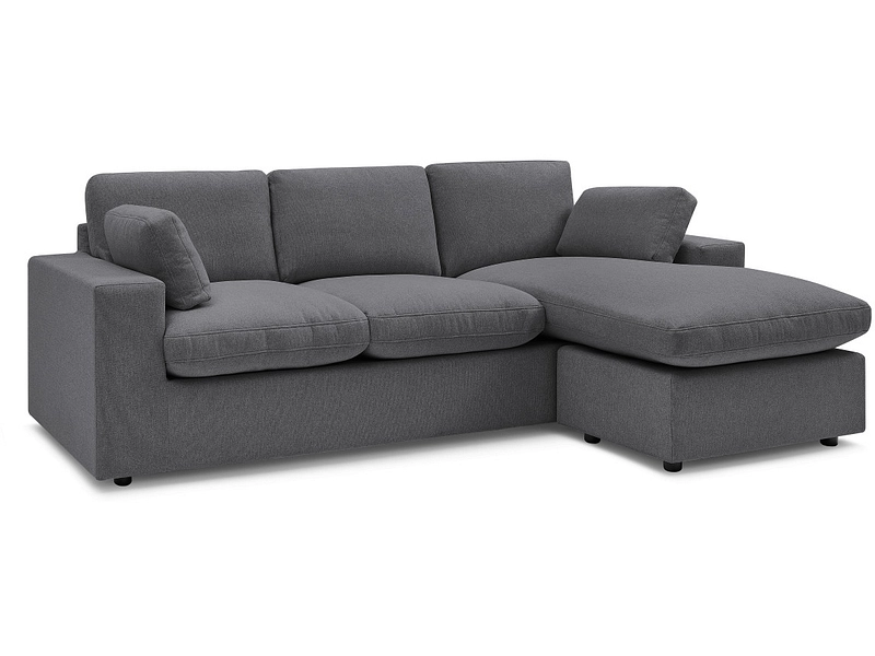 Entdecke das Ecksofa BOBOCHIC BELAIR in dunkelgrauem Stoff, eine elegante Wahl für dein Wohnzimmer. Sein Stoffbezug aus 100% Polyester bietet einen angenehmen Griff. Dank des hochelastischen Schaumstoffs lässt sich dieses Sofa problemlos in alle Räume integrieren und verspricht dir einen optimalen weichen Komfort für unvergleichliche Entspannungsmomente. Die Ausrichtung der Ecke ist umkehrbar, so dass du das Sofa ganz einfach an die Einrichtung deines Raumes anpassen kannst. Das Gestell ist aus Kiefern- und Buchenholz gefertigt und sorgt für dauerhafte Stabilität. Die Kissen sind mit silikonisierten Faserflocken gefüllt und sorgen für einen weichen Touch. Weitere Farben und Grössen sind erhältlich.
