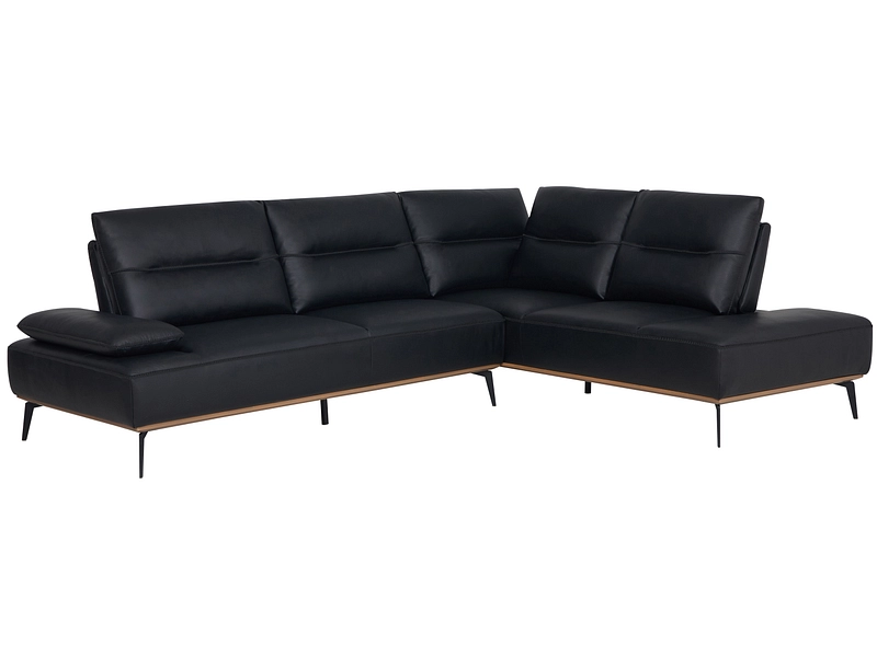Entdecke das Ecksofa PALERMO aus schwarzem Echtleder, ein wahres Schmuckstück an Komfort und Eleganz! Der Bezug aus Rindsleder verleiht dir ein unvergleichliches Gefühl von Luxus, während das Gestell aus Sperrholz für Robustheit und Langlebigkeit sorgt. Die schwarzen Metallfüsse verleihen dem Stuhl einen modernen und raffinierten Touch. Nutze die 5 verstellbaren Rückenlehnen, um die Tiefe nach deinen Wünschen anzupassen (von 53 bis 94 cm), und die anpassbare Tiefe der Meridianliege (von 188 bis 237 cm) für einen individuellen Komfort. Auch die Armlehne lässt sich manuell verstellen. Die Sitzfläche und die Rückenlehne sind mit Polyesterfasern und Schaumstoff gepolstert und sorgen für einen weichen Empfang und optimale Unterstützung. Sein rechter Winkel fügt sich perfekt in dein Wohnzimmer ein.