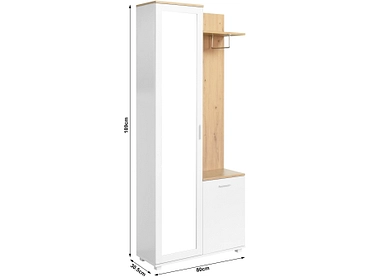 Die Garderobe LULLY mit den Massen 80x30.5x189cm und den Farben Weiss und Eiche bietet dir ein modernes und zeitloses Design, mit dem du deinen Raum verschönern kannst. Im Inneren findest du praktische Ablagen, um deine Sachen zu organisieren. Eine Garderobe zum Aufhängen deiner Kleidung ist ebenfalls enthalten. Der Schrank ist aus Spanplatte und MDF gefertigt, was ihn robust macht, während die Kunststofffüsse für Stabilität sorgen. Der grosse Spiegel macht es dir leicht, dich vorzubereiten. Mit seinen vielen Ablagemöglichkeiten ist dieser Kleiderschrank die ideale Lösung, um den Platz in deinem Zimmer optimal zu nutzen.