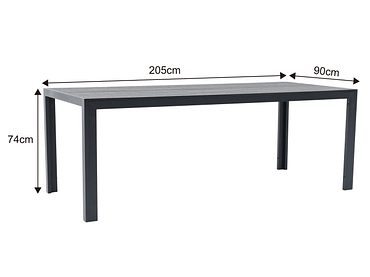 Entdecke den Gartentisch SIDE 205x90x74cm, das perfekte Element, um deinen Aussenbereich zu verschönern. Sein Gestell aus schwarzem Aluminium garantiert dir Robustheit und Leichtigkeit. Seine rechteckige Tischplatte aus Polywood mit mattem Finish bietet einen warmen und eleganten Look, der Holz perfekt nachahmt und gleichzeitig wetterfest ist. Mit seinen grosszügigen Massen von 205x90x74cm ist er ideal, um deine Gäste bei geselligen Mahlzeiten zu bewirten. Seine vier Füsse sorgen für einen sicheren Stand. Geniesse unvergessliche Momente im Freien mit diesem Tisch, der bis zu 60 kg belastbar ist. Er ist in weiteren Grössen erhältlich, sodass du den Tisch finden kannst, der perfekt in deinen Raum passt. Seine matte Oberfläche fügt sich harmonisch in jeden Gartenstil ein.