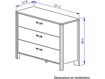 - Die Oberseite der Kommode besteht aus 22 mm starkem Melamin in Mineralfarbe. Die beiden vorderen Ecken sind für eine optisch weichere Optik abgerundet. Die Kommode ist vorne mit zwei dicken, an den Aussenecken abgerundeten Stützen erhöht. So kann man sich nicht stossen und verletzen. In Frankreich hergestellt.