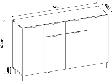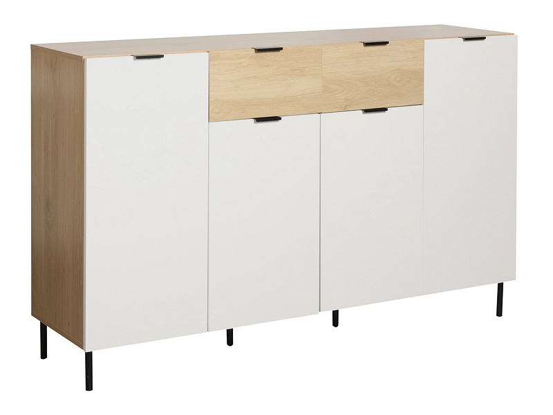 Entdecke die Kommode BASEL mit 4 Türen und 2 Schubladen, ein elegantes Möbelstück mit den Massen 40x140x92.5cm, das mit seiner Farbe in Weiss und Holz dein Zuhause erhellen wird. Die Fronten aus MDF und die Struktur aus Spanplatten verleihen ihr Robustheit und Langlebigkeit. Die Metallfüsse verleihen ihm einen modernen Touch. Nutze seine höhenverstellbaren Regale für eine individuelle Aufbewahrung. Der Soft-Close-Verschluss der Türen sorgt für eine geräuscharme und sanfte Nutzung. Die Schubladen sind geräumig, um deine Sachen zu organisieren.