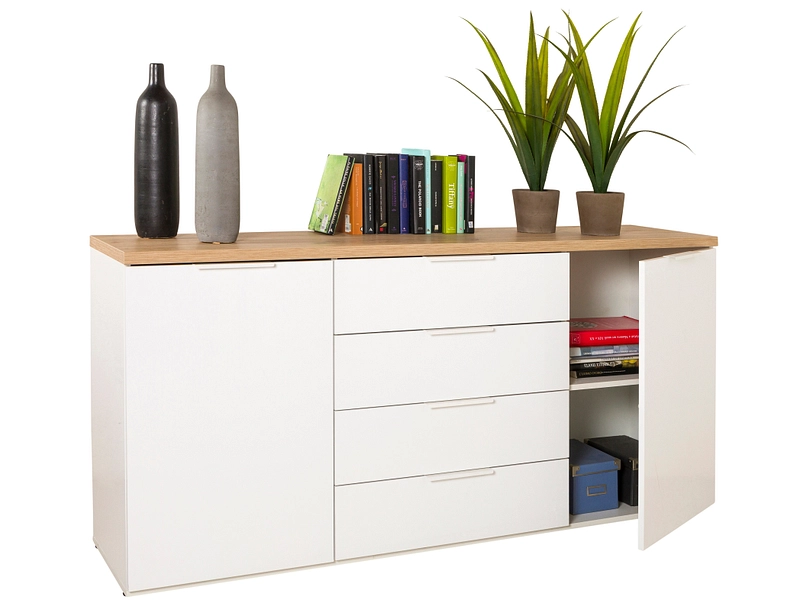 Das MUNDI Sideboard ist ideal, um deinen Raum zu organisieren. Mit seinen zwei Türen und vier Schubladen hast du ein geräumiges und vielseitiges Möbelstück. Die Melaminharzbeschichtung in glänzendem Weiss und Eiche Handwerk lässt deinen Raum erstrahlen. Seine Masse von 44.5x170x82.6cm machen ihn zu einem perfekten Aufbewahrungsmöbel. Die verschleissfesten Griffe aus mattweissem Metall verleihen ihm einen Hauch von Eleganz. Es verfügt über einen Einlegeboden für eine optimale Organisation. Das Material der Front und des Gestells besteht aus Spanplatte. Das Holz ist FSC-zertifiziert gemischt.