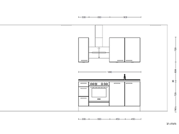 • Küchenzeile bestehend aus 1 Spülenunterschrank, 1 Herdumbauschrank, 1 Unterschrank mit 1 Schubkasten und 2 Auszüge, 2 Wandschränke