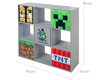 Das Regal BIOME MINECRAFT 90x30x90cm mit seinen 9 Fächern und 4 grauen Einlegeböden bietet einen geräumigen und organisierten Stauraum. Seine lackierte Oberfläche verleiht deiner Einrichtung einen Hauch von Eleganz. Das aus MDF gefertigte Regal ist robust und ästhetisch zugleich. Geniesse sein modernes und funktionales Design, das sich perfekt für die Aufbewahrung deiner Bücher, Dekorationsgegenstände oder Lieblingsspiele eignet. Die Drucköffnung der 5 Türen ist ein praktisches und diskretes Extra. Schaffe mit diesem Minecraft-Regal einen ordentlichen und stilvollen Raum.