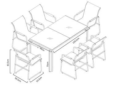 Das Set aus Gartentisch und Stühlen BASTIA aus schwarzem Stahl wird deinen Aussenbereich verwandeln. Mit seinem robusten Stahlgestell und der Tischplatte aus gehärtetem Glas ist dieser Tisch für die Ewigkeit gemacht. Geniesse gesellige Momente mit diesem Set, das aus einem Tisch und sechs Stühlen besteht. Die Stühle sind mit Textilene bezogen und bieten optimalen Komfort. Das Textilene ist wasserabweisend und somit ideal für den Einsatz im Freien. Der Tisch kann ein maximales Gewicht von 60 kg tragen und jeder Stuhl bis zu 110 kg. Bewundere das moderne und elegante Design, das sich perfekt in deinen Garten oder deine Terrasse einfügt.