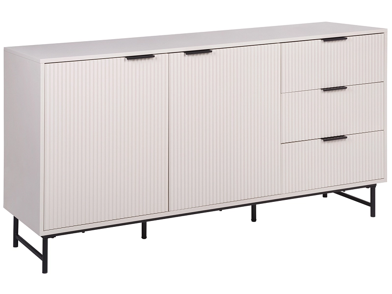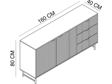 Das Sideboard ONARIA 40x160x80cm ist ein elegantes Möbelstück, das deiner Wohnung einen modernen Touch verleiht. Mit seinen großzügigen Abmessungen bietet es viel Stauraum. Bewundere sein einzigartiges und originelles wellenförmiges Finish. Seine Füße und Griffe aus Metall verleihen ihm eine raffinierte industrielle Note. Die Flügeltüren ermöglichen dir einen leichten Zugriff auf deine Sachen. Das ONARIA Sideboard ist aus strapazierfähiger Spanplatte gefertigt, die seine Langlebigkeit gewährleistet. Seine grau-schwarze Farbe lässt sich leicht in verschiedene Einrichtungsstile integrieren. Jede Schublade kann ein maximales Gewicht von 5 kg tragen, während jeder Einlegeboden bis zu 10 kg tragen kann. Die Griffe haben ein mattes Finish.