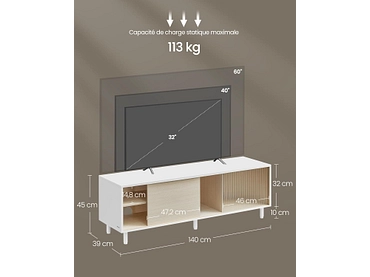 Entdecke das SONGMICS TOOLLESS TV-Möbel 140cm weiss, ein eleganter Stauraum für dein Wohnzimmer. Mit einer Länge von 140cm ist es ideal, um einen Fernsehbildschirm von bis zu 60 Zoll zu tragen. Seine strahlend weisse Farbe fügt sich harmonisch in jede Einrichtung ein. Das TV-Möbel ist aus hochwertigen Spanplatten gefertigt und vereint Ästhetik und Robustheit. Dank des praktischen Designs ist das Aufstellen von Multimedia-Geräten und Zubehör ganz einfach. Dieses TV-Möbel wird deinem Wohnraum einen modernen Touch verleihen. Nutze sein schlichtes Design und seine Funktionalität, um deine Fernsehecke stilvoll einzurichten. Mit diesem Möbelstück profitierst du von einer optimalen Einteilung und einem angenehmen Unterhaltungsbereich. Es lässt sich schnell und einfach aufbauen, sodass du dich schnell an deinem neuen Möbelstück erfreuen kannst. Sein moderner Stil wertet die Atmosphäre in deinem Wohnzimmer auf.