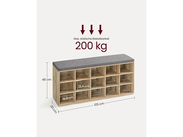 - Ce meuble à chaussures dispose de 15 casiers ouverts pour ranger vos chaussures qui resteront faciles d’accès. Chaque compartiment, d’une profondeur de 30 cm