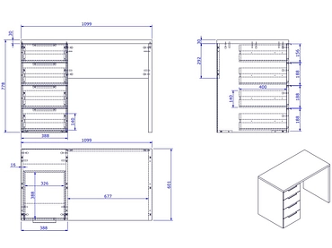 - 4 tiroirs, sur glisssières métalliques. Plateau épaisseur 3 cm