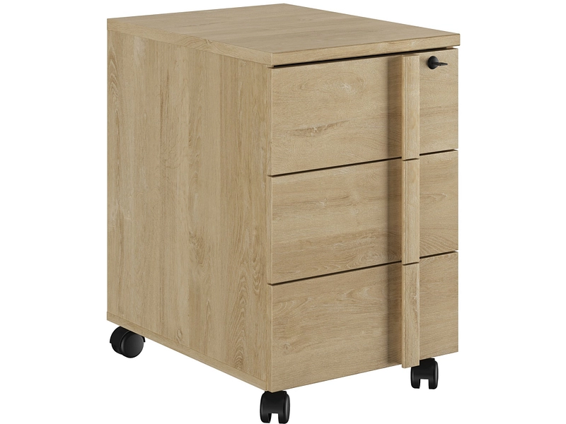 - 3 tiroirs de rangement dont celui du haut avec serrure. Ouverture par prise de main en mdf enrobé coloris chêne clair