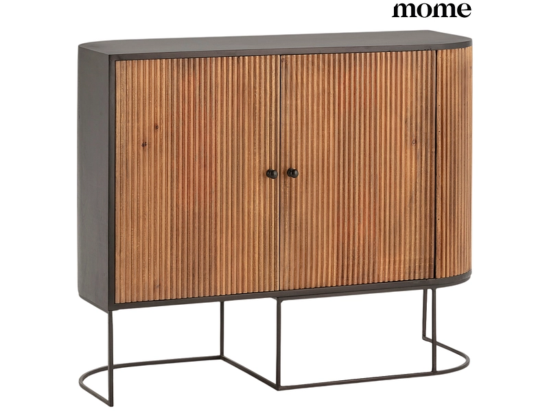 - Façades rainurées en bois naturel, sculptées à la main, avec piètement en métal noir fin et stable.