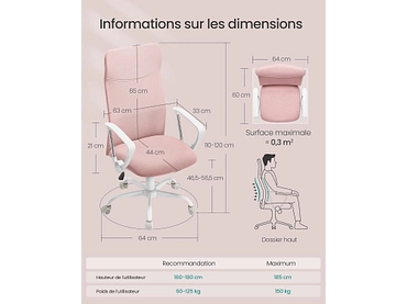 Découvre le fauteuil de bureau BRANDON SONGMICS en métal, un ajout élégant et confortable à ton espace de travail. Profite de son assise renforcée et de son revêtement en tissu doux pour un confort optimal pendant tes heures de travail. Le dossier réglable multipositions te permet d'ajuster l'inclinaison selon tes préférences pour un soutien personnalisé. Grâce à son assise réglable en hauteur, tu peux facilement adapter le fauteuil à ta morphologie et à la hauteur de ton bureau. Il est monté sur des roulettes pratiques, ce qui facilite tes déplacements autour de ton espace de travail. Ses accoudoirs intégrés offrent un soutien supplémentaire à tes bras et à tes épaules, réduisant ainsi la fatigue. Son design rose et blanc apporte une touche de fraîcheur et de modernité.