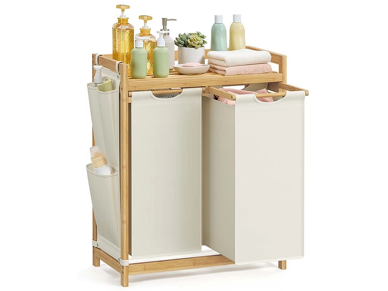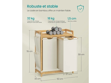 - 2 compartiments de tri Ce panier à linge a un volume total de 100 L (50 L pour chaque sac). La conception à 2 compartiments vous permet de trier vos vêtements par type ou de séparer les vêtements clairs des vêtements foncés.