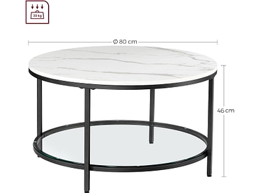 La table basse CRYSTAL SONGMICS blanche, avec ses dimensions de 80x80x45cm, deviendra la pièce centrale de ton salon. Son plateau supérieur offre un élégant effet marbre, tandis que le plateau inférieur en verre ajoute une touche de légèreté et de modernité. La structure en métal assure robustesse et durabilité. Les pieds noirs, ajustables en hauteur, garantissent une stabilité parfaite, même sur les sols irréguliers. Cette table basse supporte une charge maximale de 30kg, idéale pour tes magazines, télécommandes ou décorations. Son design rond et épuré s'intègre harmonieusement dans tout type d'intérieur.
