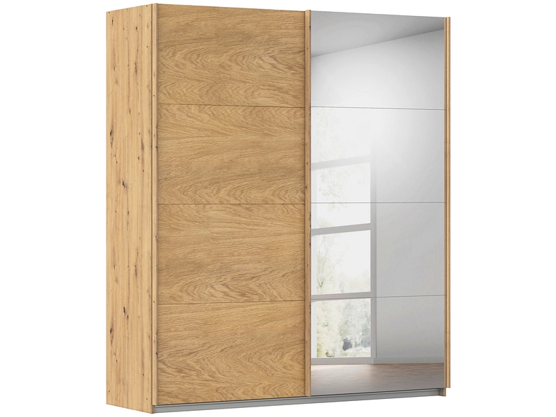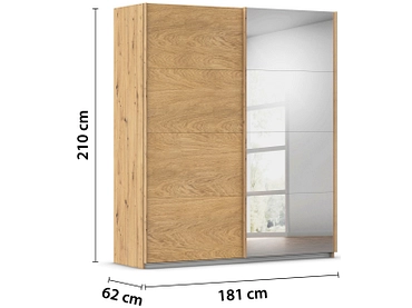 L'armadio ad ante scorrevoli MATTERHORN offre un elegante spazio di archiviazione grazie alle sue due ante. La disposizione interna facilita l'organizzazione dei vostri effetti personali. Una delle ante è realizzata con impiallacciatura in rovere massiccio, che conferisce un tocco caldo e naturale. L'altra anta è dotata di uno specchio, ideale per prepararsi. Il corpo dell'armadio, realizzato in parte in legno massiccio, è di un raffinato colore rovere lavorato a mano. Questo armadio è disponibile anche in altri colori e dimensioni, in modo da poter personalizzare il vostro spazio come desiderate. Il frontale combina un pratico specchio con un pannello di particelle di legno resistente. Il sistema di ante scorrevoli è perfetto per gli spazi ristretti.