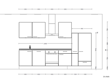 • Mobile cucina composto da 1 base lavello, 1 pensile cucina, 1 base con 1 cassetto, 1 ripiano e 1 anta, 1 frigorifero a colonna con 1 cassetto, 3 pensili, 1 dispensa
