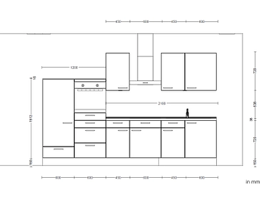 • Mobile cucina composto da 1 base lavello, 1 base piano cottura, 2 basi con 1 cassetto, 1 ripiano e 1 anta, 1 frigorifero con conversione in elettrodomestico alto con 1 cassetto, 1 forno con conversione in elettrodomestico alto con 2 cassetti e 2 cassettoni, 3 pensili
