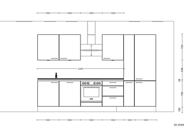 • Angolo cottura composto da un mobile sotto il lavello, un mobile sotto il piano cottura, una base, 3 pensili, un armadio alto, un frigorifero/congelatore automatico e un armadietto per i medicinali.