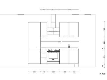 • Mobile cucina composto da 1 base lavello, 1 pensile cottura, 1 base con 1 cassetto e 2 cassettoni, 2 pensili, 1 colonna, conversione elettrodomestici, cella frigorifera