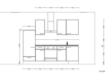 • Angolo cottura composto da 1 mobile sottolavello, 1 mobile da incasso per fornello, 2 mobili base con 1 cassetto, 1 ripiano e 1 anta, 1 mobile alto da incasso per frigorifero, 3 pensili.