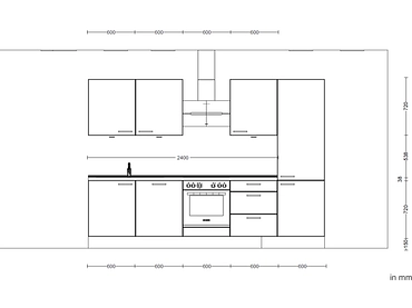 • Angolo cottura composto da 1 mobile sottolavello, 1 mobile da incasso per fornello, 1 mobile base, 3 pensili, 1 mobile alto