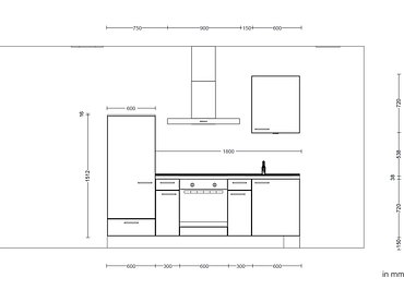• Angolo cottura composto da 1 mobile sottolavello, 1 mobile base con 1 cassetto, 1 ripiano e 1 anta, 1 mobile da incasso per piano cottura, 1 mobile base con 1 cassetto, 1 ripiano e 1 anta, 1 mobile alto da incasso per frigorifero, 1 pensile.