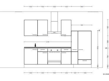 • Angolo cottura composto da 1 mobile sottolavello, 1 mobile da incasso per fornello, 2 mobili base con 1 cassetto, 1 ripiano, 1 anta, 1 mobile alto da incasso per frigorifero, 1 armadio farmacia, 3 armadi a muro.