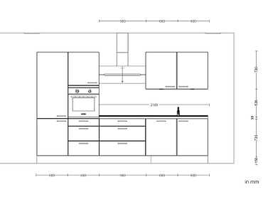 • Mobile cucina composto da 1 base lavello, 1 base piano cottura, 1 colonna Forno con 1 anta, 1 ripiano, 1 cassetto e 2 cassetti, 1 colonna Frigorifero con 1 anta, 1 anta e 1 ripiano, 2 pensili