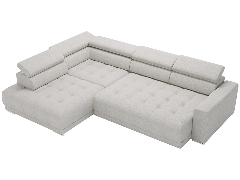 Il divano angolare MOJITO in tessuto grigio chiaro è un invito al relax. Immaginatevi di rilassarvi sulla sua comoda seduta in schiuma e molle, sostenuta da una robusta struttura in legno di pino. Le gambe in alluminio argentato aggiungono un tocco di eleganza. I poggiatesta regolabili manualmente offrono un comfort personalizzato. Il rivestimento in tessuto 100% poliestere è piacevole al tatto. Questo divano angolare in tessuto grigio chiaro diventerà sicuramente il pezzo forte del vostro salotto. Rilassatevi! Il comfort di seduta è equilibrato.