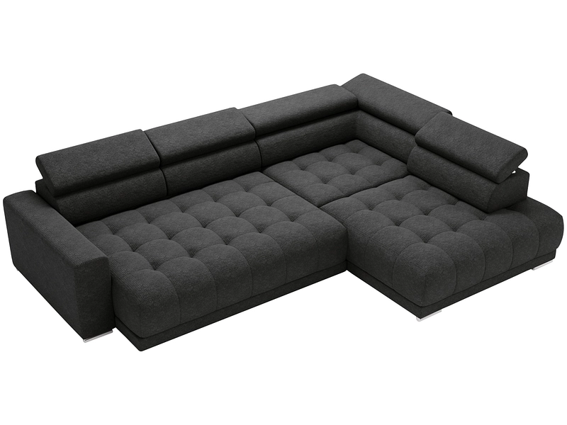Scoprite il massimo comfort con il divano angolare MOJITO in tessuto nero! Il suo angolo retto ottimizza lo spazio abitativo. Ammirate le sue gambe in alluminio argentato, che aggiungono un tocco di eleganza. Vi piacerà il comfort equilibrato della seduta, imbottita di schiuma e molle, e dello schienale in schiuma PU. La struttura in tessuto, realizzata al 100% in poliestere, è piacevole al tatto. I poggiatesta regolabili manualmente consentono di personalizzare il comfort. La struttura in legno di pino è estremamente robusta. Godetevi un salotto moderno e confortevole progettato per durare nel tempo.