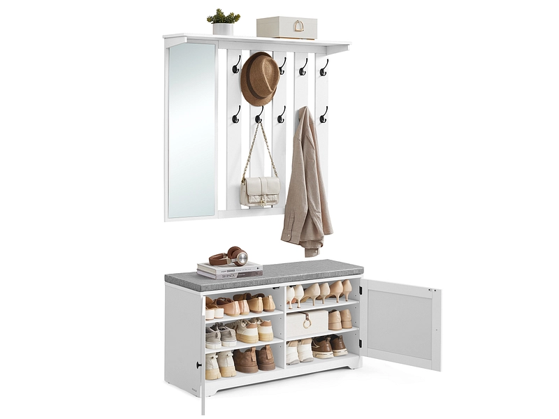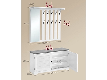 - Set completo di mobili per l'ingresso che, grazie allo specchio, ai 10 ganci, alla panca e al vano contenitore chiuso, soddisfa ogni esigenza