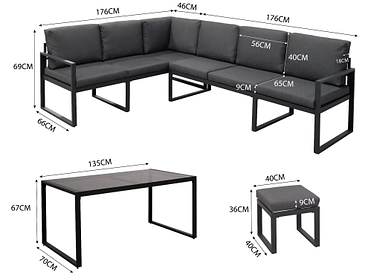 Scoprite il set da giardino SAMY Steel nero, ideale per arredare con stile il vostro spazio esterno. Questo set comprende un divano angolare, due sgabelli e un tavolo, che vi permetteranno di creare una zona relax conviviale. I cuscini in poliestere offrono un comfort ottimale e il loro materiale idrorepellente è perfetto per l'uso all'aperto. Godetevi il design moderno con la sua struttura in acciaio inossidabile e il piano in vetro temperato fumé. L'imbottitura in schiuma PU della seduta e dello schienale garantisce un comfort duraturo. Il tessuto è composto al 100% da poliestere. Inoltre, i cuscini sono sfoderabili per una facile manutenzione. Il divano angolare misura L176*P172xH66 cm, gli sgabelli L40*P40*H36 cm e il tavolo L135*P70*H67 cm. Tutti in nero e antracite, per dare un tocco di eleganza al vostro giardino o terrazzo.